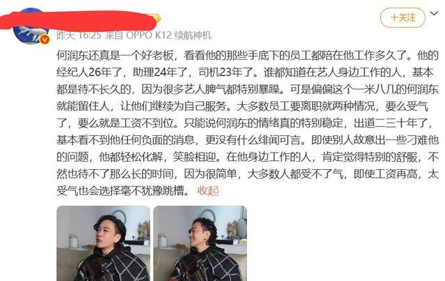 很多人问,为什么何润东能红这么久?看看他身边的那些人就知道了。一个愿意跟了你26年的经纪人,赌上的是职业生涯;一个跟了24年的助理,付出的是青春;一个跟了23年的司机,守住的是秘密。在这个浮躁的圈子里,有人靠脸吃饭,有人靠资本硬撑,但何润东靠的是“做人”。